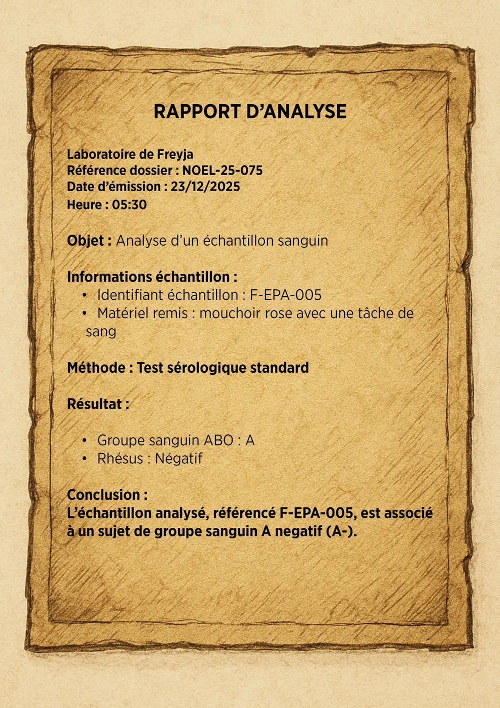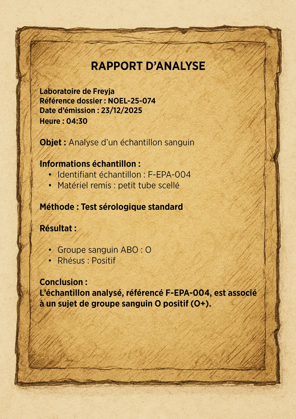 Freyja récupère l'échantillon de sang, elle vous tiendra informé dès qu'elle aura les résultats d'analyse de l'échantillon. Elle ajoute que Zéphir est revenu à lui ce matin, vous pouvez aller l'interroger.