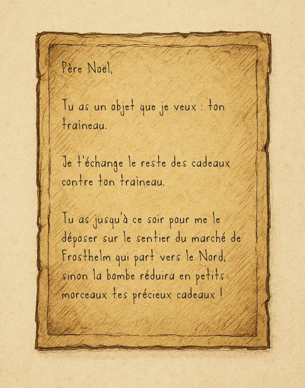 Le Père-Noël vient de recevoir une lettre où le voleur écrit qu'il fera exploser le reste des cadeaux s'il ne lui cède pas son traîneau...